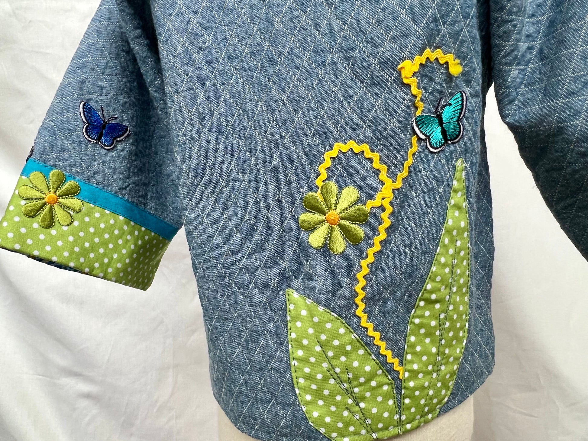 Pre Quilted denim jacket. Double trim and special applique. Fully lined in lime green polka dot cotton.