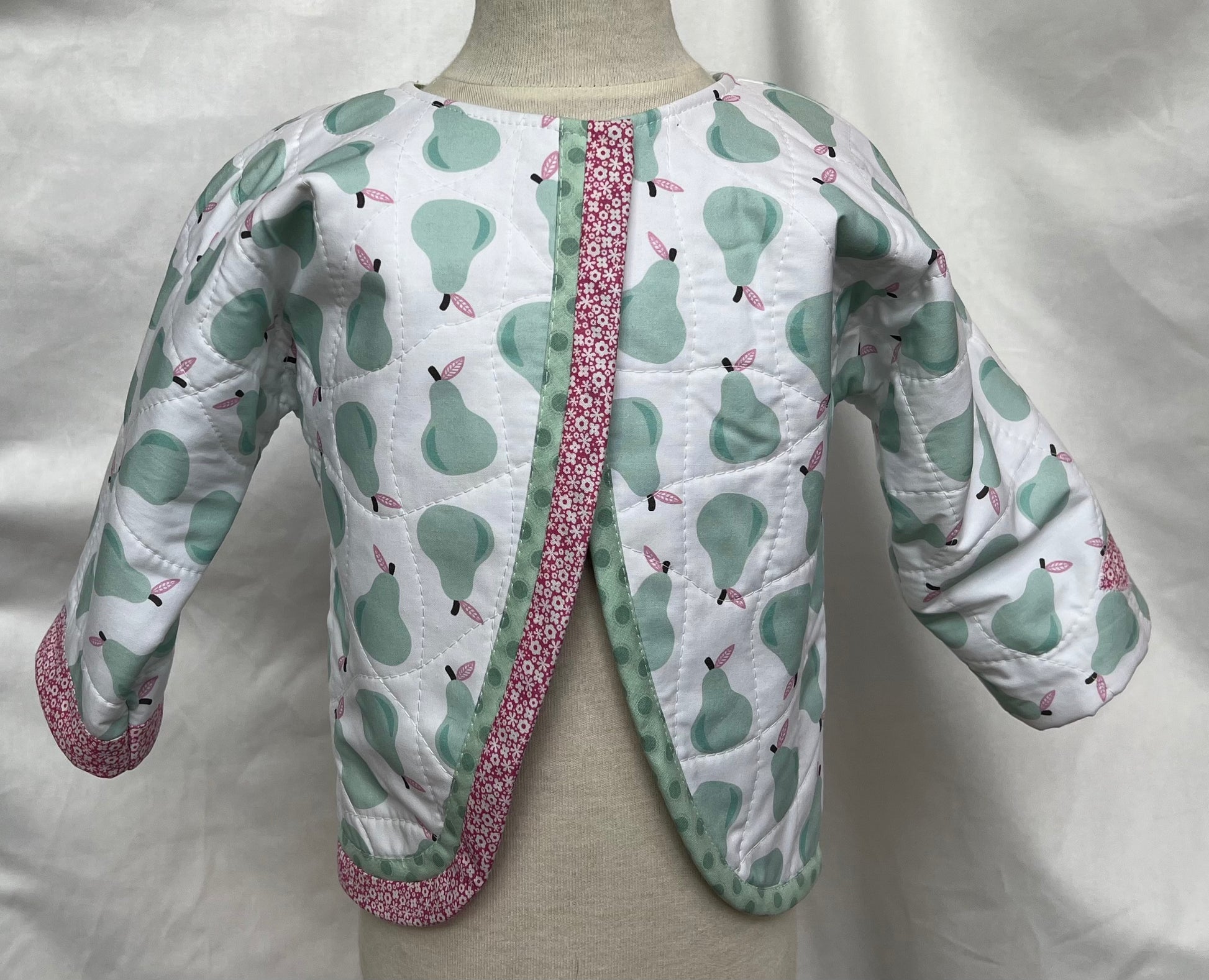 1-4-U times 2 quilted aqua pears, fully lined, machine quilted , double bias trim, 3/4 length sleeve