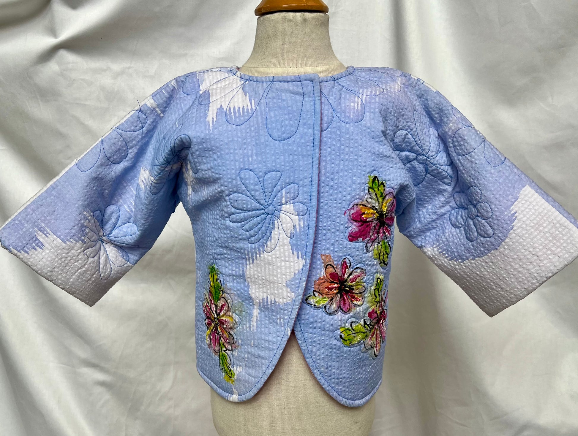fully lined, machine quilted, hand painted, 3/4 length sleeve